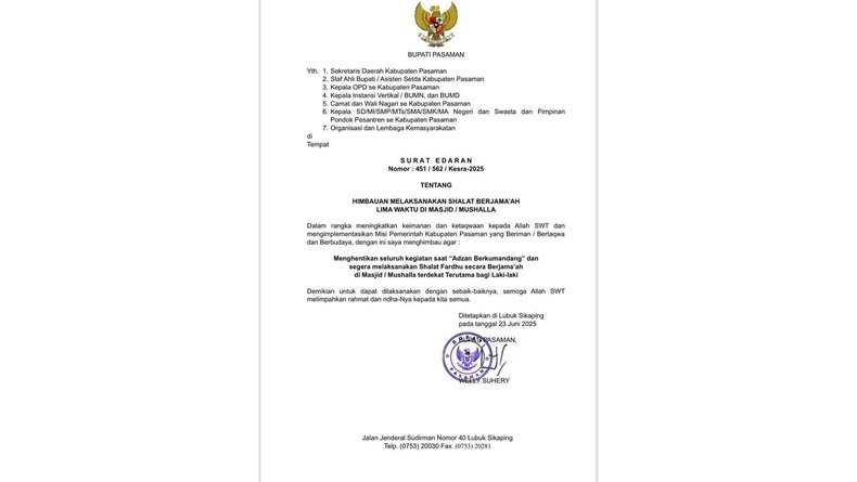 Bupati Pasaman Terbitkan Edaran, Ajak Warga Hentikan Aktivitas Saat Azan dan Shalat Berjamaah