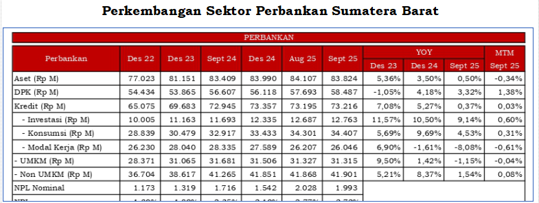PADANG, iNEWSPadang.ID — Performa sektor jasa keuangan (SJK) di Sumatera Barat menunjukkan stabilitas yang kuat sepanjang Triwulan III-2025, menjadi pondasi penting bagi dinamika pertumbuhan ekonomi regional. Indikasi positif ini sejalan dengan pertumbuhan Produk Domestik Regional Bruto (PDRB) Triwulan III-2025 secara tahunan (year-on-year/yoy) sebesar 3,36 persen.