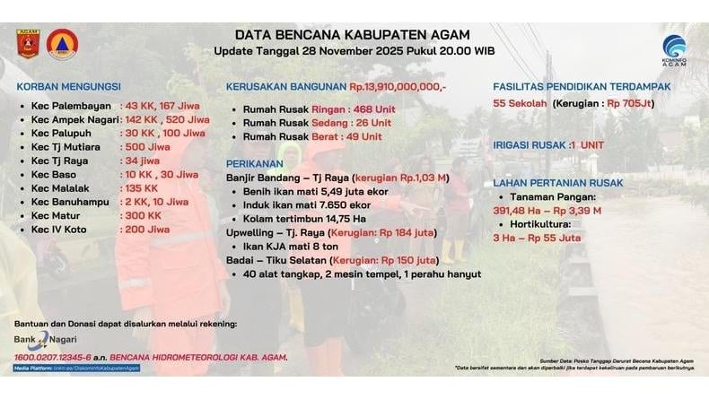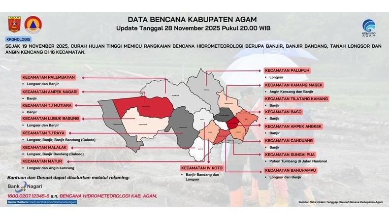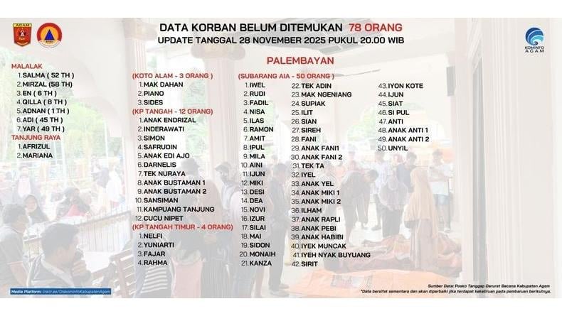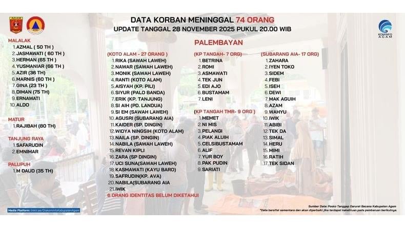 Secara keseluruhan, jumlah korban meninggal di Kabupaten Agam telah mencapai 74 orang, tersebar di Kecamatan Malalak, Palupuh, Tanjung Raya, Matur, dan terutama Palembayan sebagai wilayah terparah. Beberapa daerah seperti Malalak dan Palembayan sudah bisa dijangkau sebagian, namun sejumlah titik lain masih sulit ditembus akibat tebalnya material longsor.