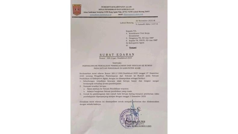 AGAM, iNEWSPadang.ID — Dinas Pendidikan dan Kebudayaan Kabupaten Agam resmi memperpanjang kebijakan belajar dari rumah hingga 3 Desember 2025. Keputusan itu tertuang dalam Surat Edaran Nomor 300.2/1303/Disdikbud-2025 yang dikeluarkan pada Minggu, 30 November 2025.