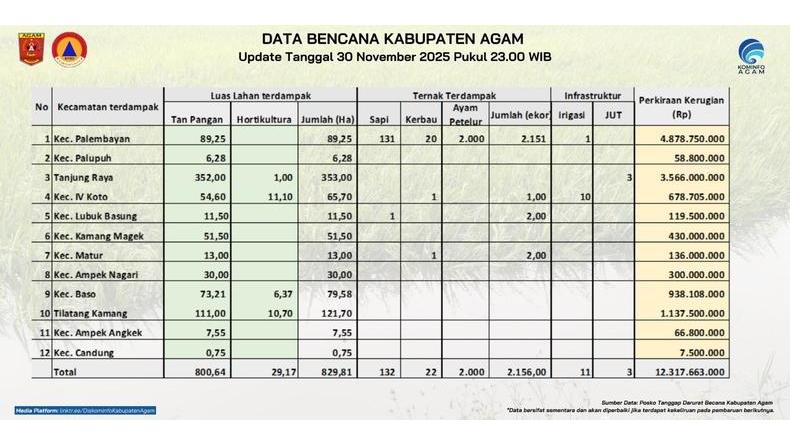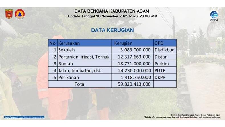 Korban Jiwa 120 Orang Meninggal, Kerugian Bencana Agam Diperbarui Jadi Rp59,8 M