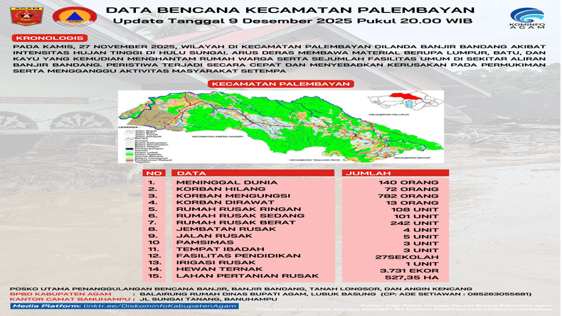 AGAM, iNEWSPadang.id— Dampak rangkaian bencana hidrometeorologi yang melanda wilayah Kabupaten Agam, Sumatera Barat sejak 19 November 2025 mencatatkan angka korban jiwa yang tragis dan kerugian material yang fantastis.